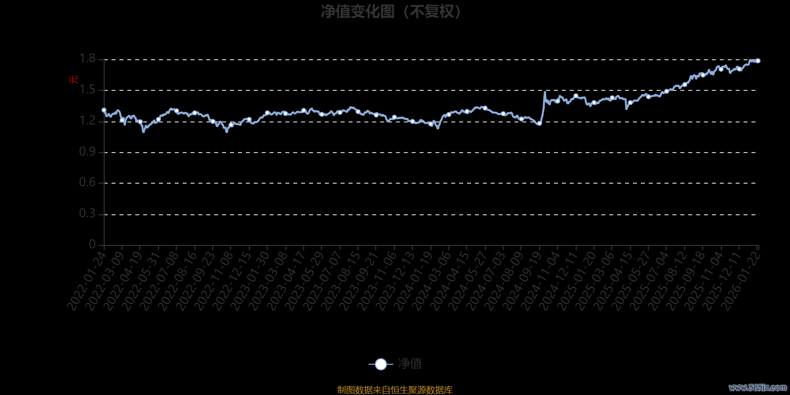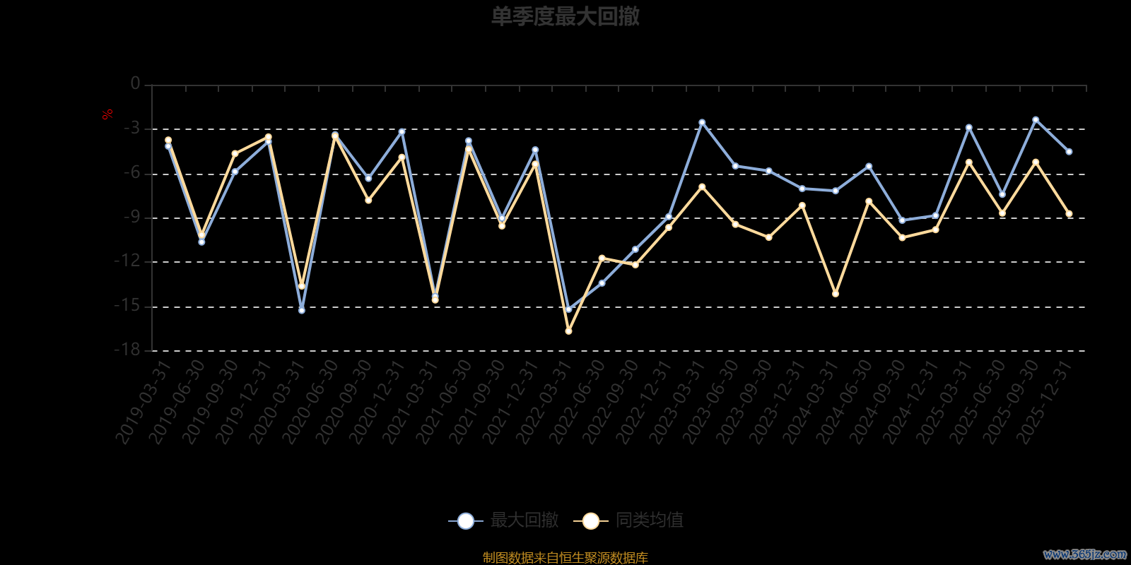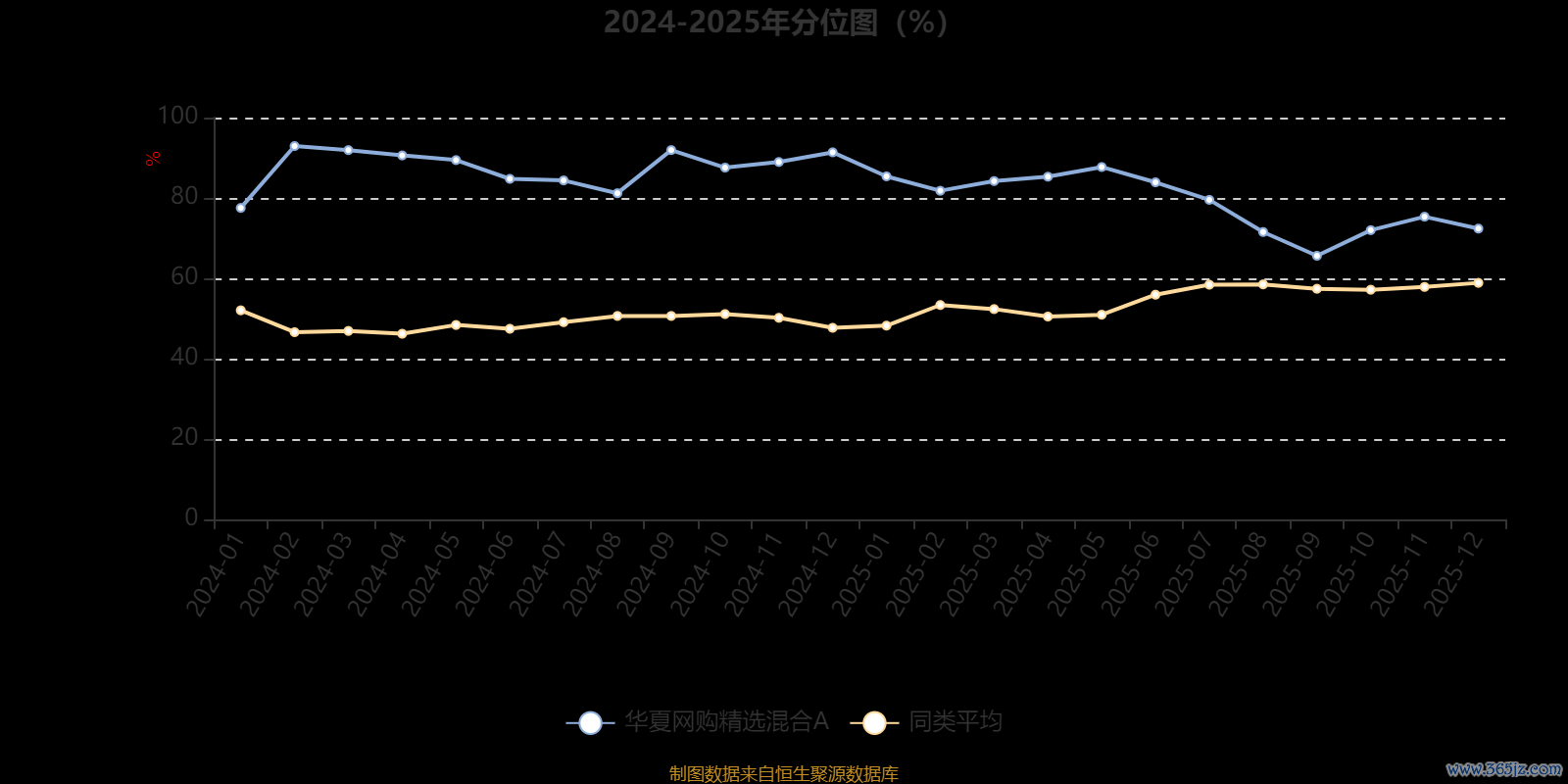 通过所选区间该基金净值增长率分位图,可以观察该基金与同类基金业绩比较情况。图为坐标原点到区间内某时点的净值增长率在同类基金中的分位数。